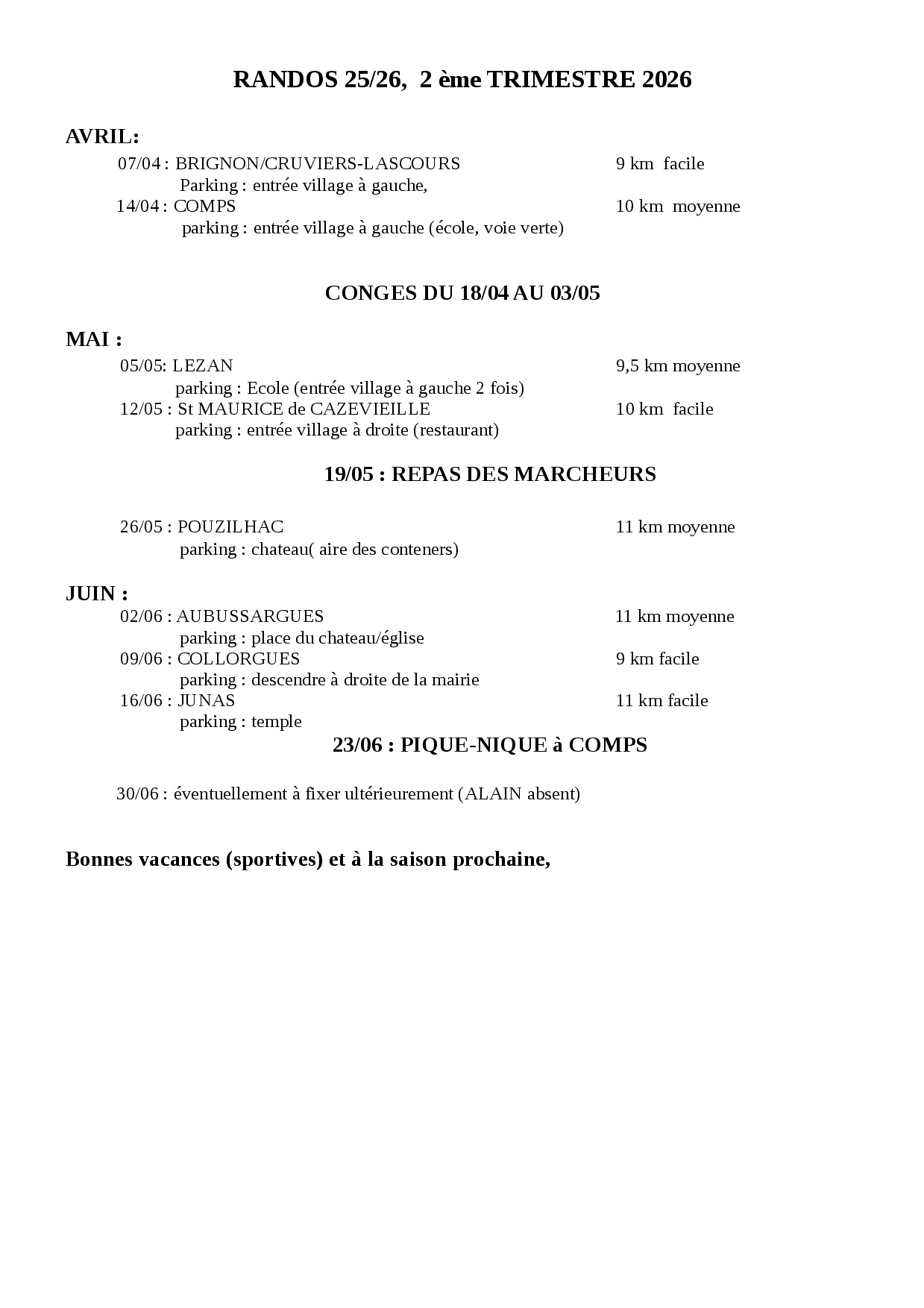 Randos 2ème trimestre 2026 proposées par Alain et Guy